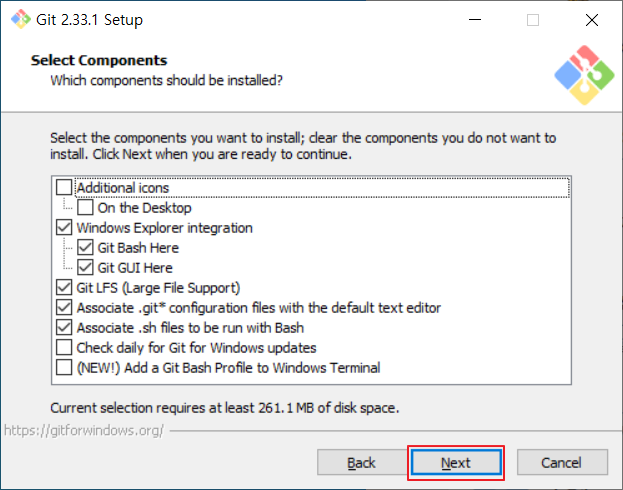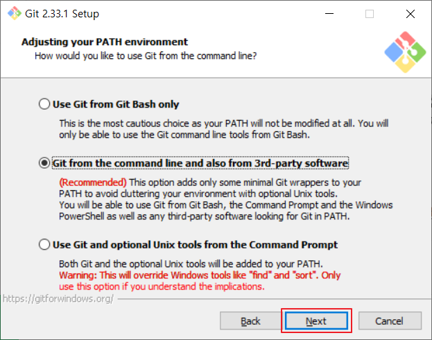 📢Git커맨드를 사용하기 위한 환경변수를 설정하고 "Next"를 눌러줍니다.