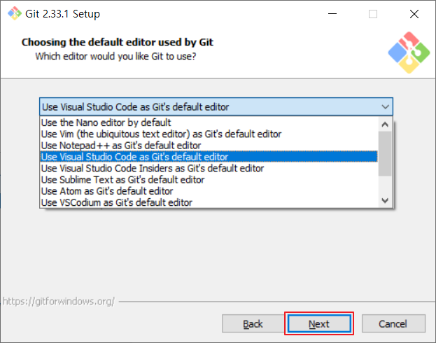 📢Git의 기본 편집기를 선택하고 "Next"를 눌러줍니다. 저는 Vim을 거의 사용하지 않아 익숙지 않은 관계로 "Visual Studio Code"를 선택했습니다. 추천사항은 없고 각자 편하신 편집기를 선택하시면 됩니다.