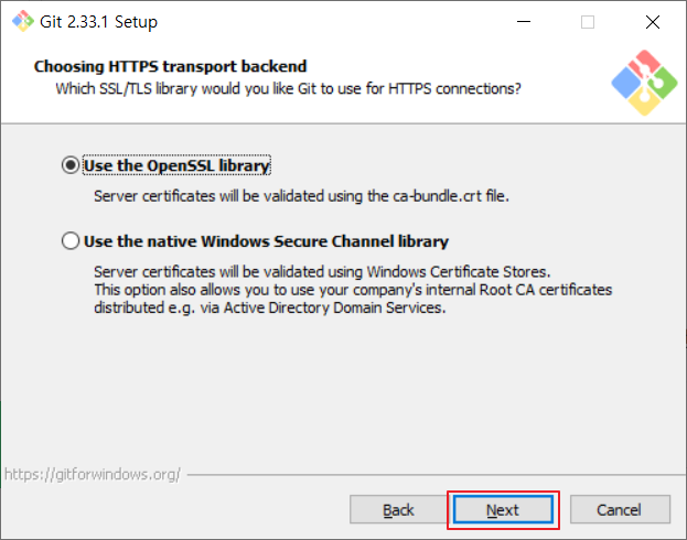 📌Use the native Windows Secure Channel library : Windows 인증서 저장소를 사용하여 검증합니다. 이 옵션은 Active Directory 도메인 서비스를 통한 회사의 내부 Root CA 인증서를 사용할 수 있습니다.