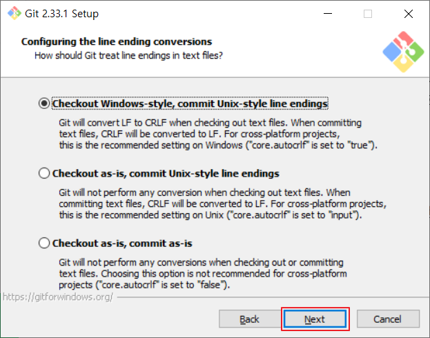 📌✅Checkout Windows-style, commit Unix-style line endings : 체크아웃은 윈도우 스타일, 커밋은 유닉스 스타일로 자동 변경되도록 설정합니다.