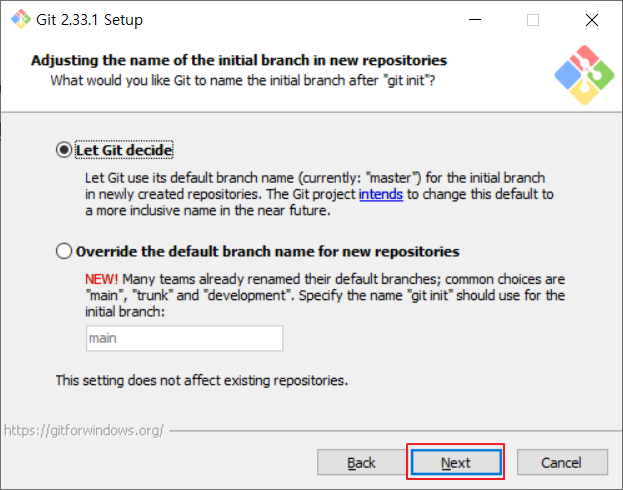 📢새 Repository를 생성할 때 initial branch 이름을 지정하는 방법을 선택 후 "Next"를 눌러줍니다.