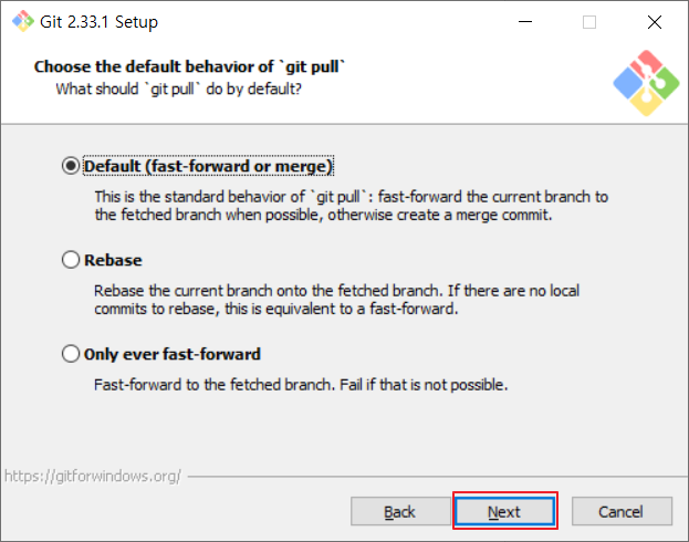 📢'git pull' 명령어에 수행될 작업을 선택하고 "Next"를 눌러줍니다.