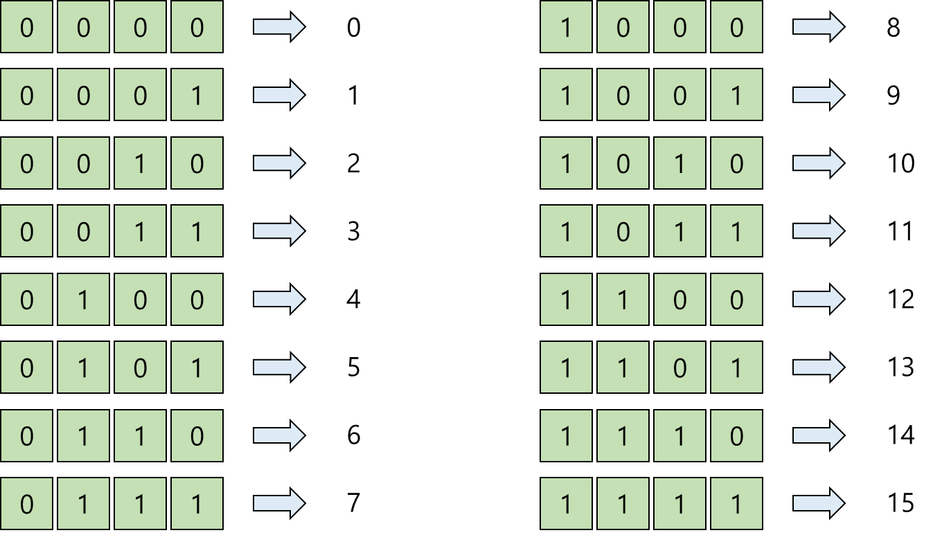 즉 반복문을 4번이나 중첩시키는 대신, 이진수 값을 1씩 증가시키는 편이 더욱 효율적인 방법이 되겠다. 이 원리를 바탕에 둔 방법이 바로 다음에 이어진다.