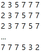 Ex) 입력으로 [2, 3, 5, 7, 7, 7]을 받았을 경우, 다음과 같이 순열 생성
