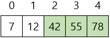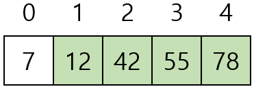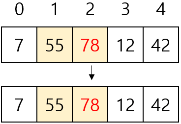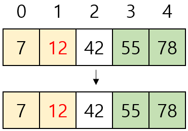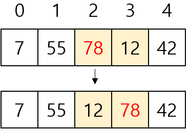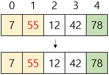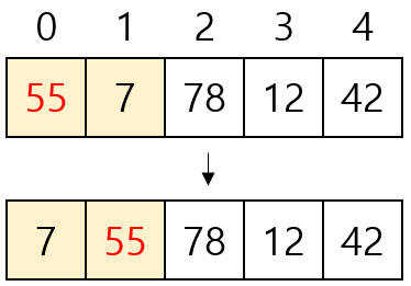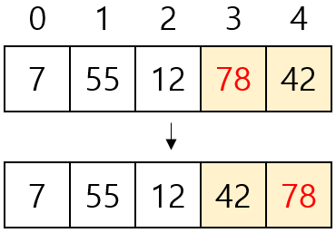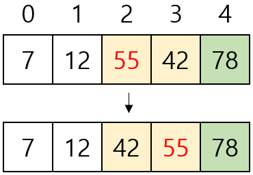 - [7, 12, 42, 55, 78]을 버블 정렬하기 위해 비교는 10번, 교환은 5번 수행됐다.